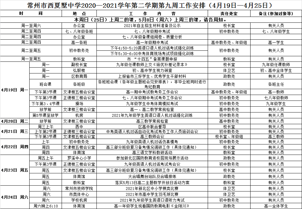 西夏墅中学2020—2021学年第二学期第九周工作安排