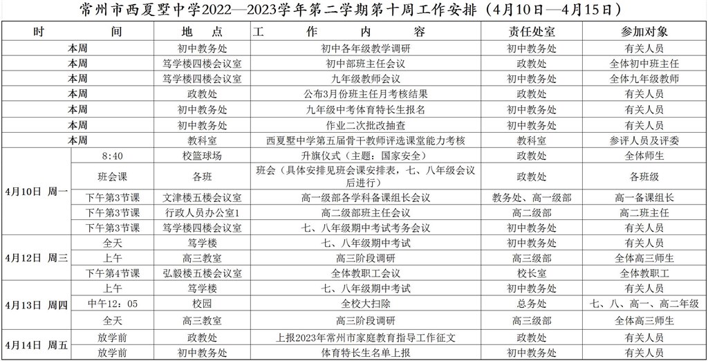 西夏墅中学2022—2023学年第二学期第十周工作安排